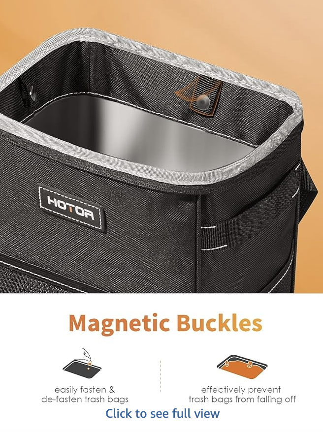 - ✔MAGNETIC SNAPS: There are 4 metallic magnetic snaps inside of HOTOR car trash can for fastening the extra trash bag. Compared with traditional car trash cans, those 4 little snaps make the replacement of car trash bags easier. Simply unsnap the magnetic snaps to replace the used trash bag with a new one. Then snap shut the magnetic snaps to fix the extra trash bag. Just 2 steps and and it’s all set.