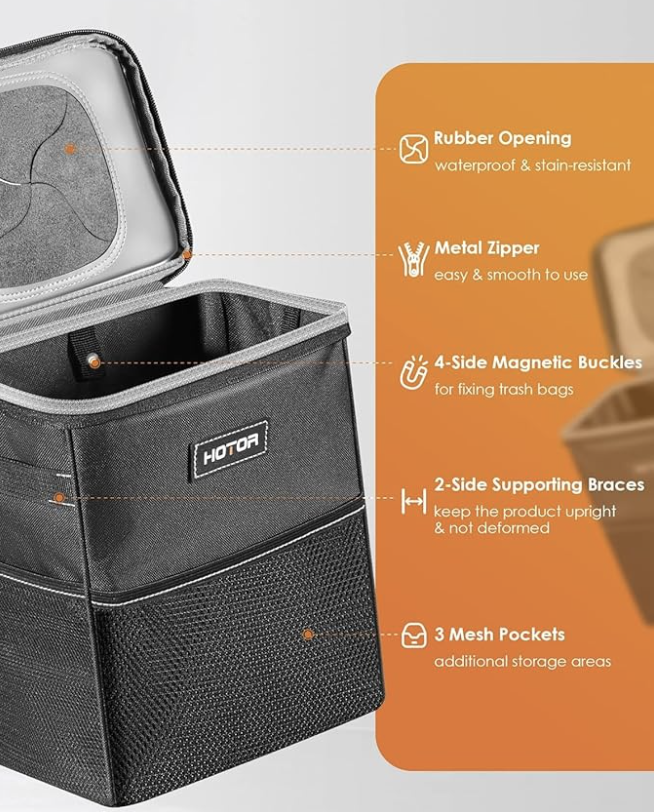 HOTOR Car Trash Can with Lid and Storage Pockets – 100% Leak-Proof Organizer, Waterproof Garbage Can, Multipurpose Trash Bin for Car, 2 Gallons, Black